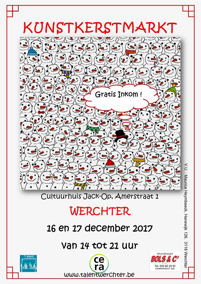 Het wordt een enige gelegenheid om kennis te maken met kunstenaars uit Rotselaar. De kunstkerstmarkt vindt plaats op zaterdag 16 en zondag 17 december 2017, telkens van 14 tot 21 uur in cultuurhuis Jack Op, Amerstraat 1 in Werchter.