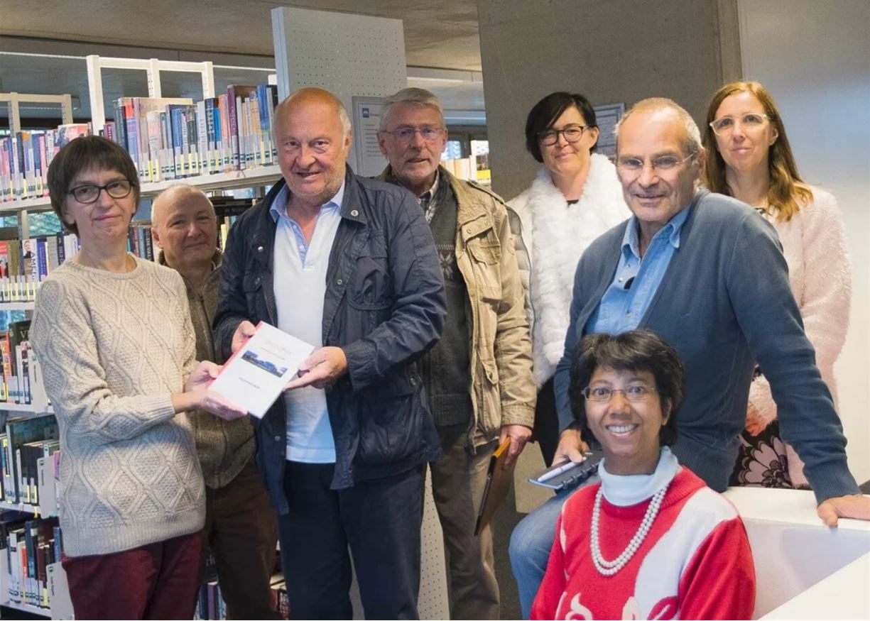 Bibliothecaris Solange De Groote mocht het eerste exemplaar van 50 van bij ons in ontvangst nemen. Tijdens de boekenbeurs is de dichtbundel te koop in zaal De Krekel.